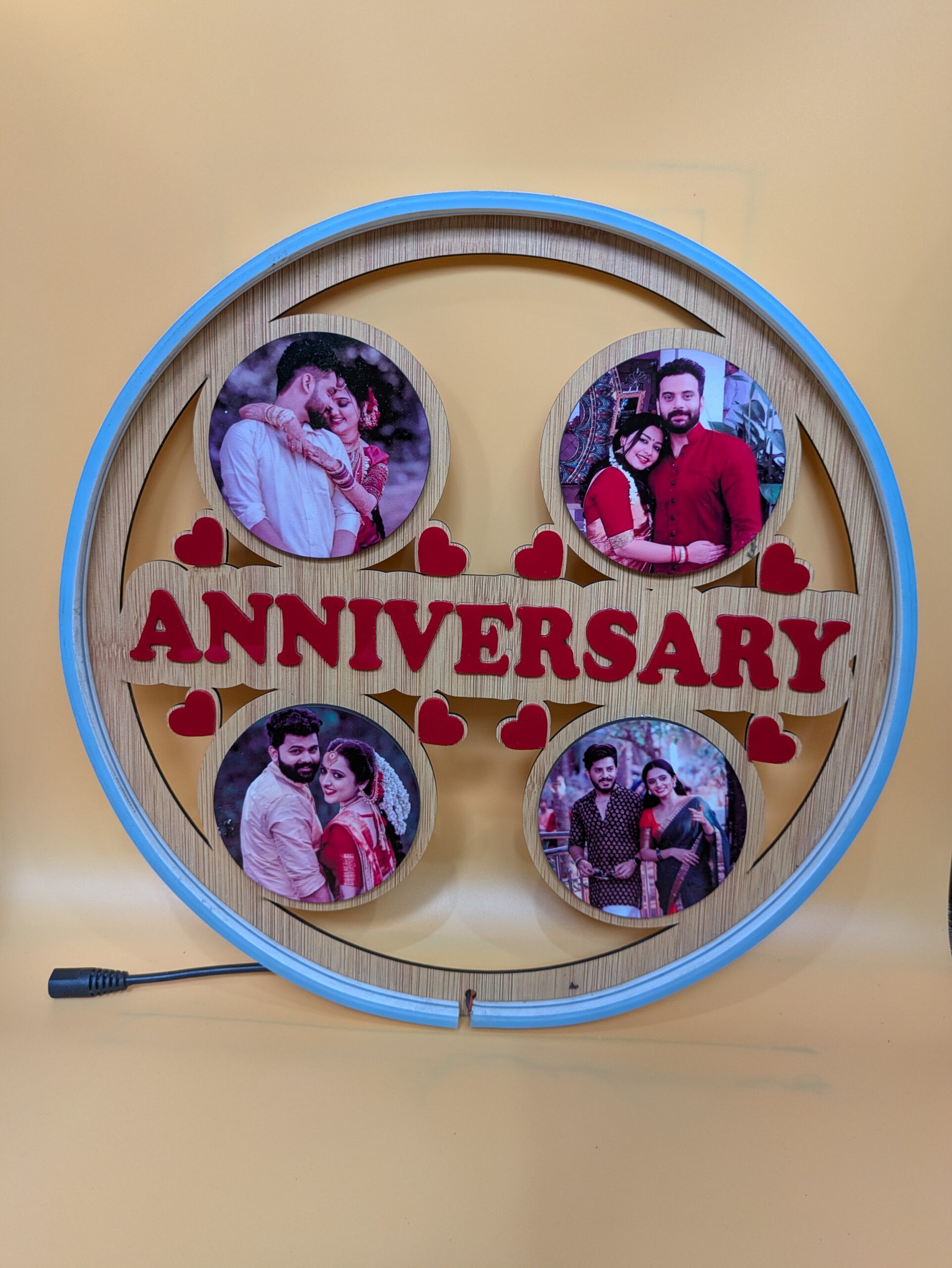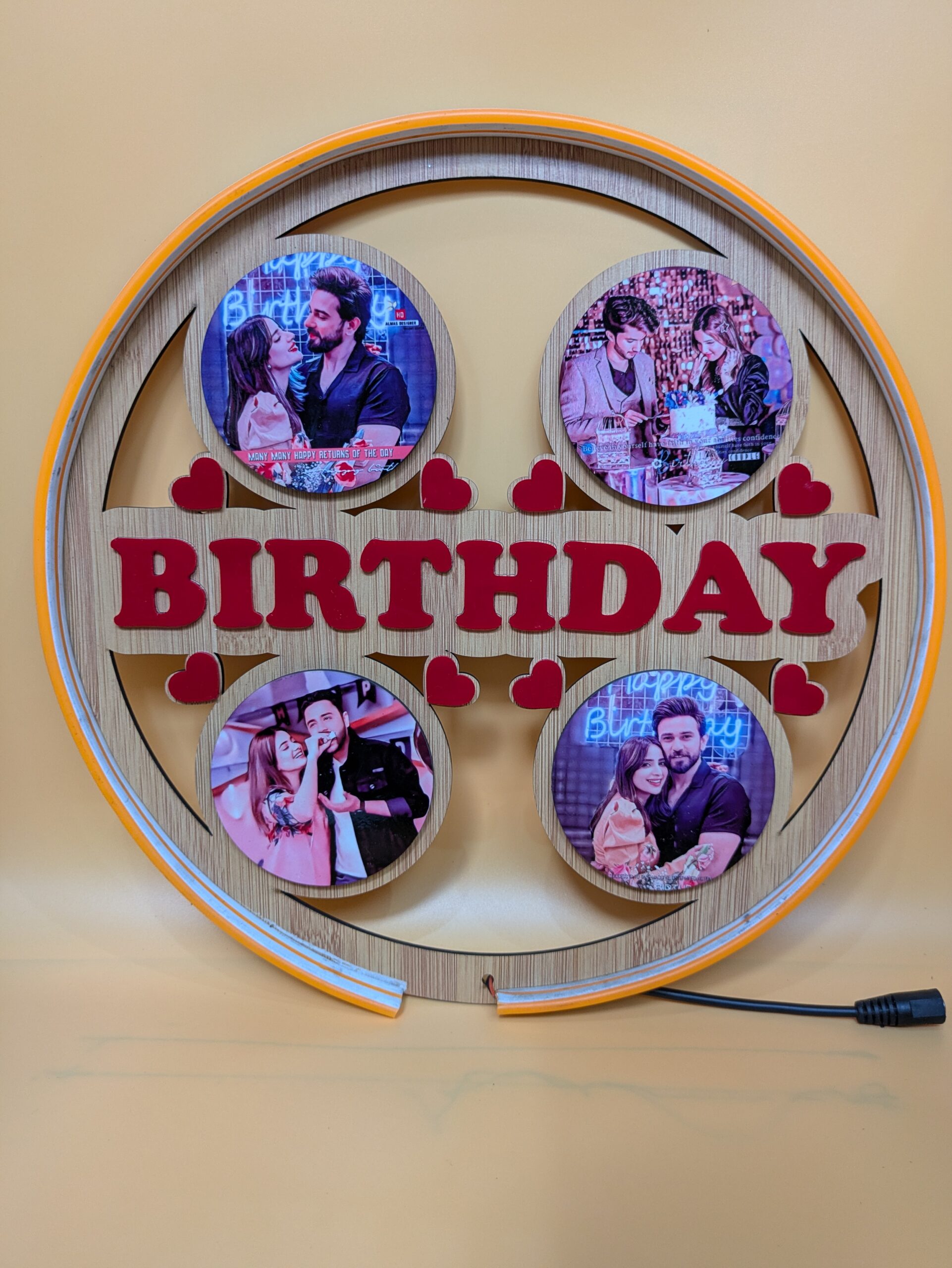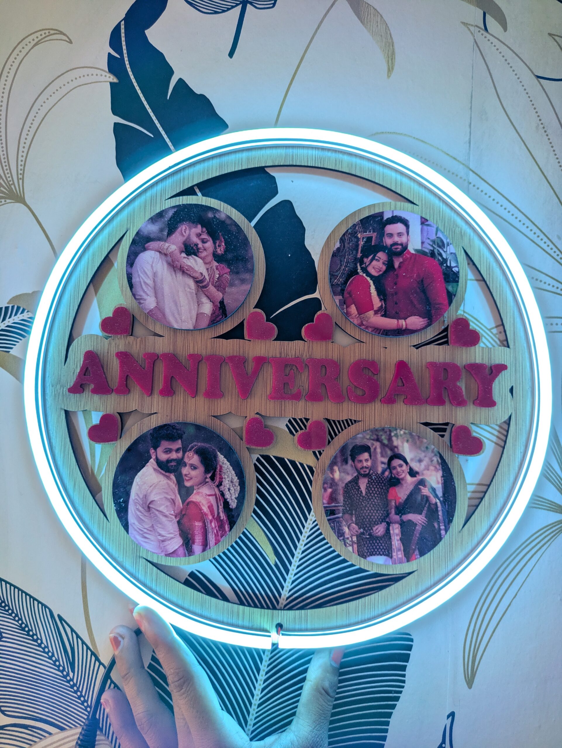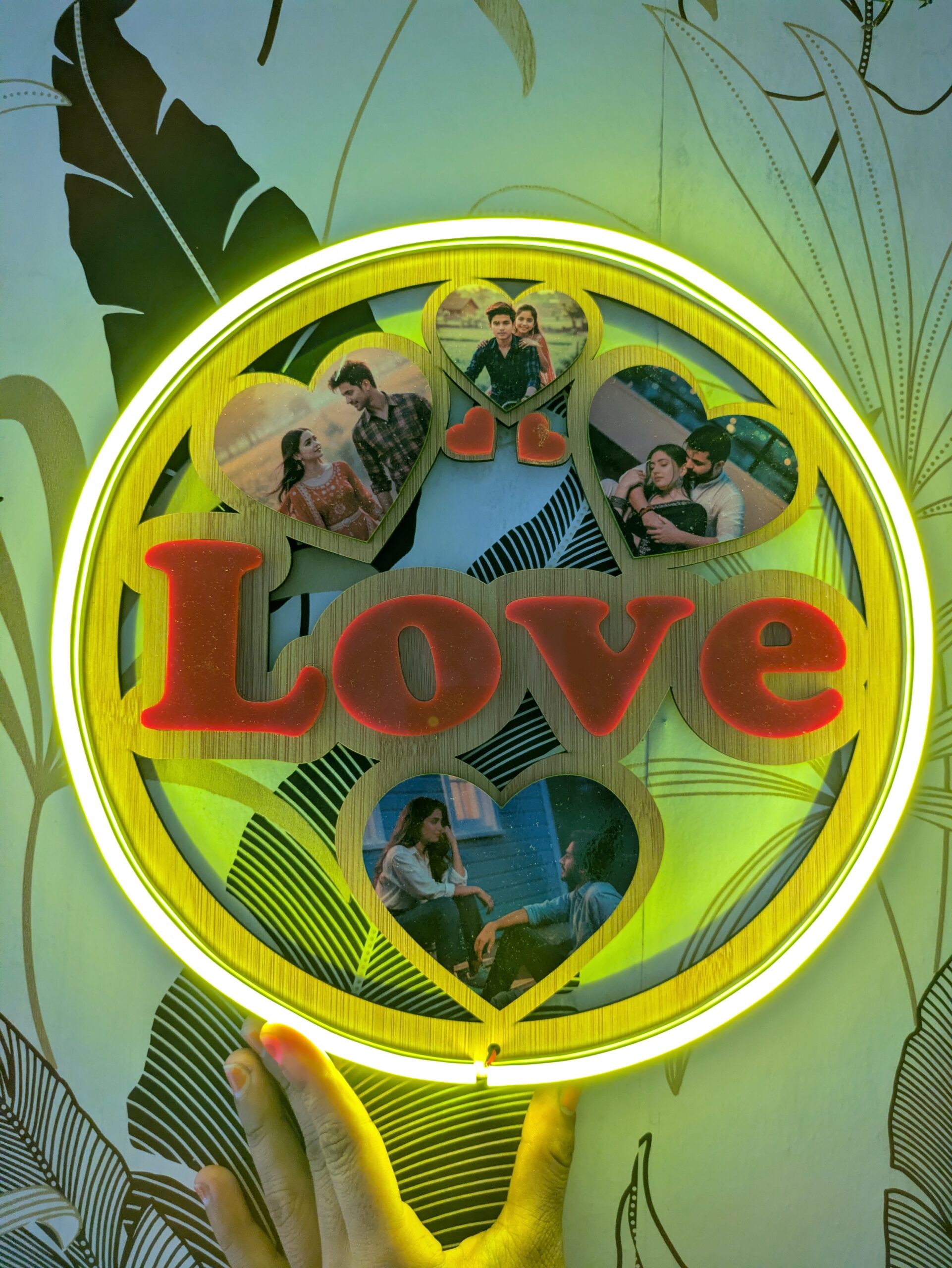 Transform your space with this enchanting LED neon love sign, featuring a modern round yellow circle frame that creates a captivating visual statement. The sign combines romantic aesthetics with practical functionality, incorporating charming photo display spaces within heart-shaped cutouts. Set against a stylish tropical palm leaf background, this wall-mounted decorative light adds a contemporary touch to any room. The bright neon-style LED illumination provides a warm, inviting glow while being energy-efficient and durable. Perfect for personalising your home, bedroom, or special event venue with cherished memories and ambient lighting. The unique design seamlessly blends modern illumination with photo display capabilities, making it an ideal focal point for creating a cosy atmosphere. This versatile piece serves both as striking wall art during the day and as a mesmerising light fixture at night. The thoughtfully designed frame allows for easy photo updates, letting you refresh your display whenever desired. Bring warmth and personality to your space with this distinctive decorative element that celebrates both light and love.